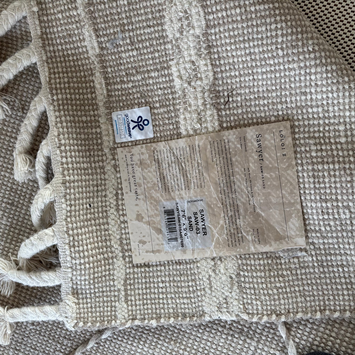 7’6” x 9’6” Sawyer Collection Wool/Cotton Area Rug in Sand with Underlay (Retail Value $650) - L354