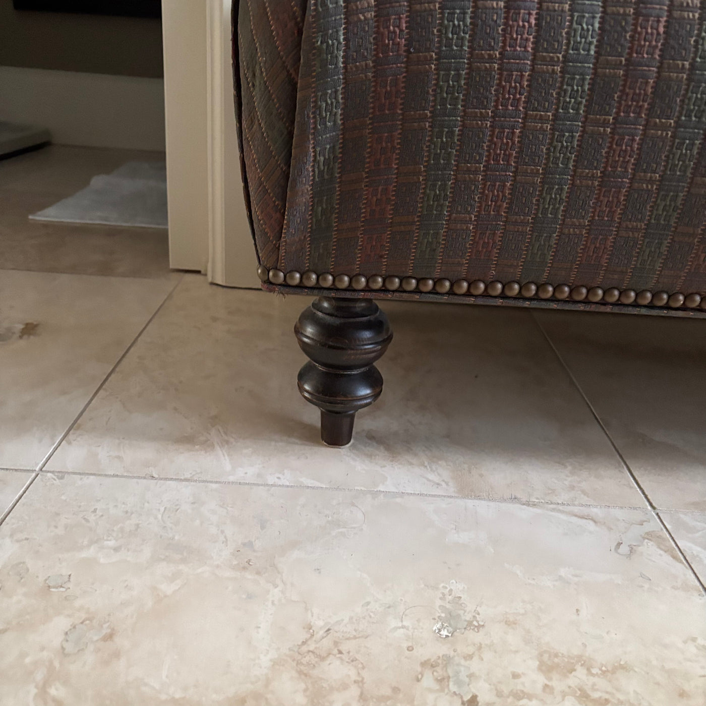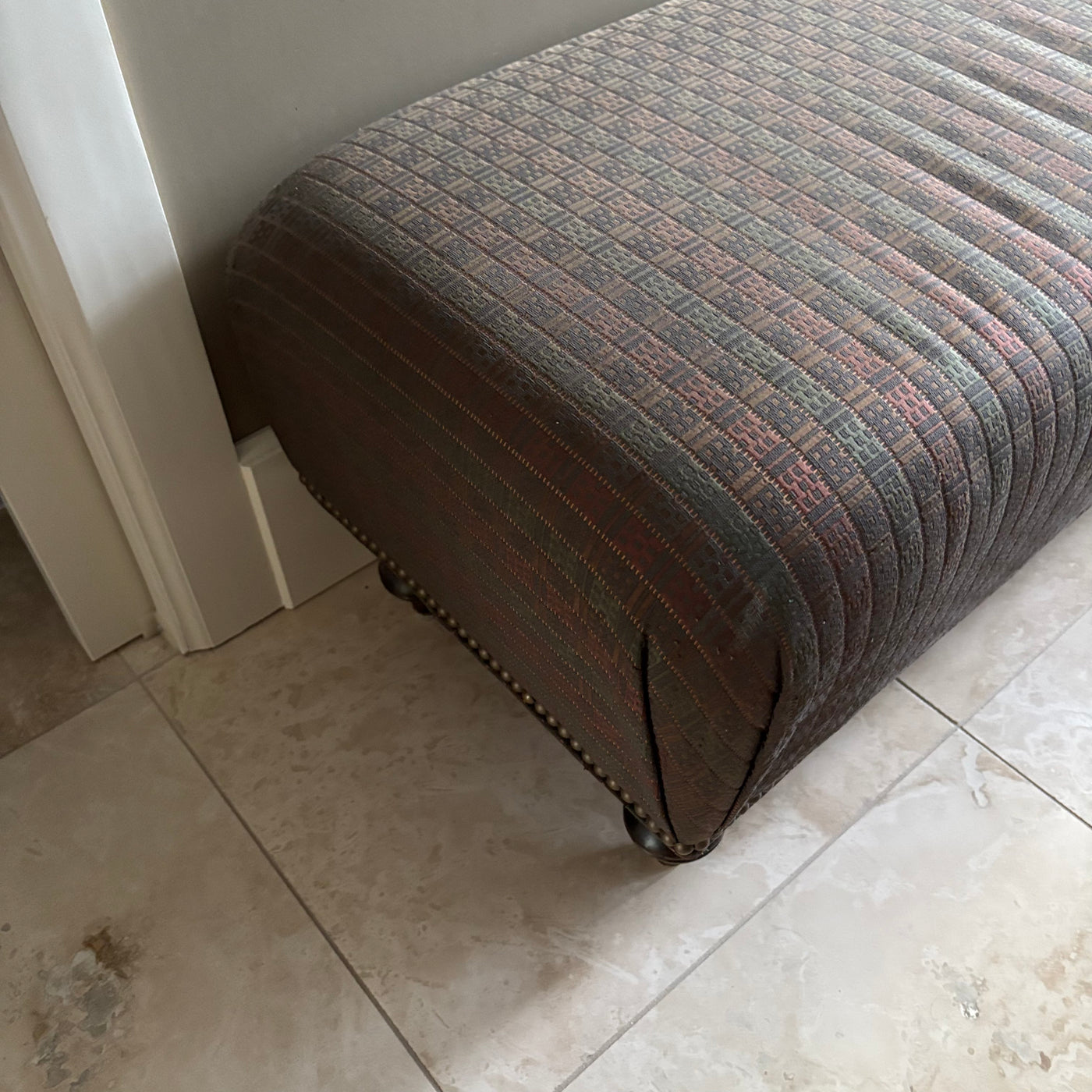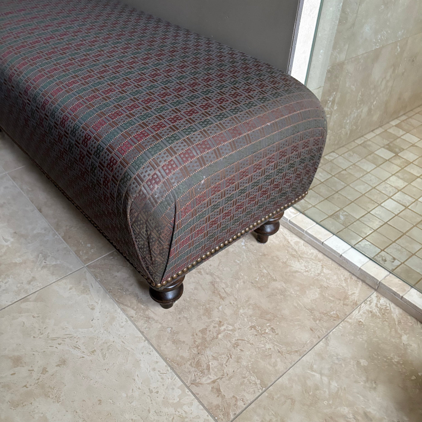Bench 16” High Bench with Grey Fabric with Green, Red Gold Pattern and Wooden Legs - M317
