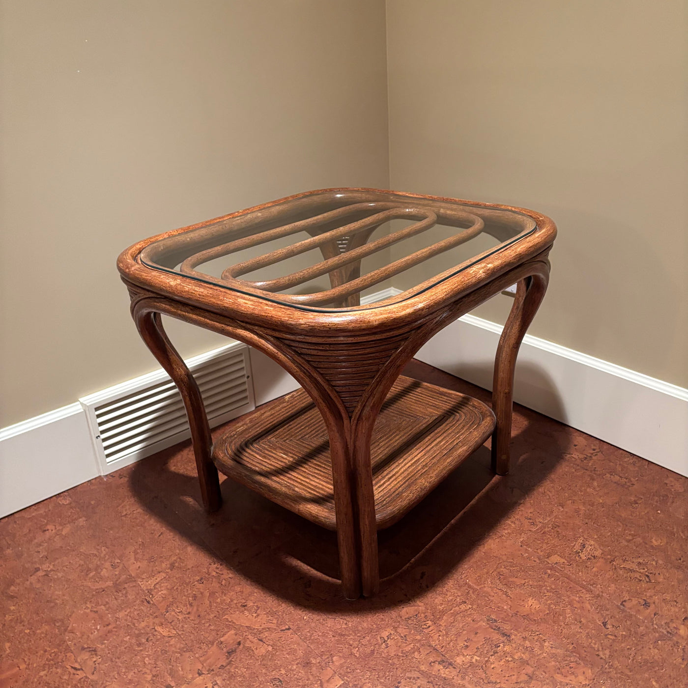 Vintage Table with Glass Top and Wood/Rattan Frame - M350