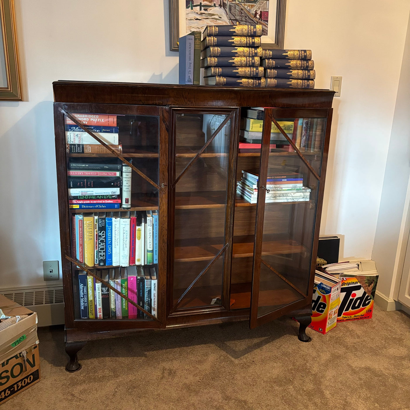 ANTIQUE DISPLAY CABINET WITH 3 GLASS DOORS AND WOODEN SHELVES (CABINET ONLY - CONTENTS NOT INCLUDED) - P208