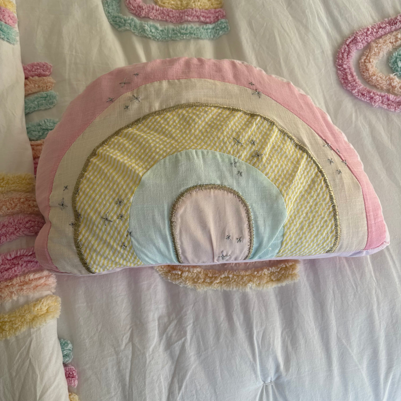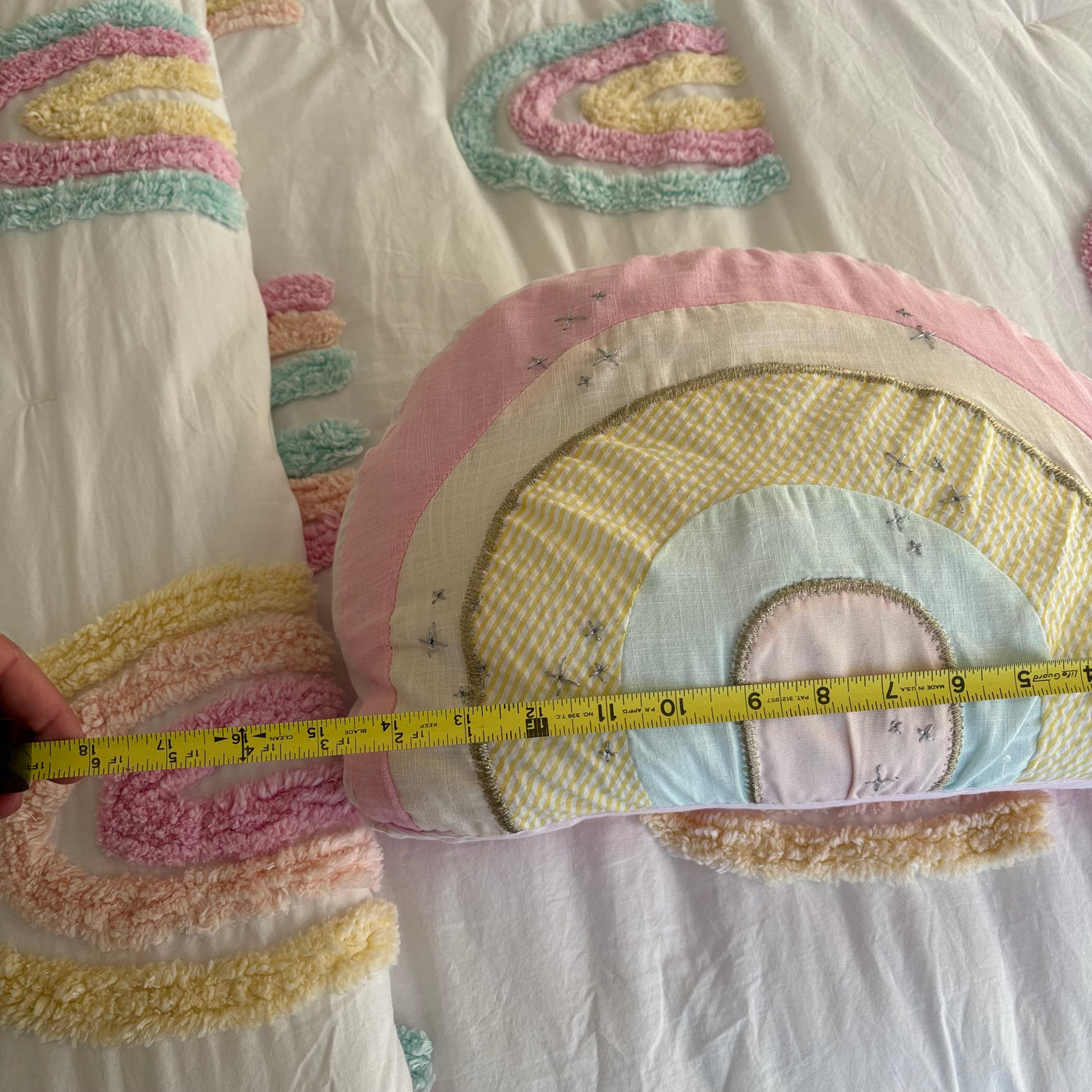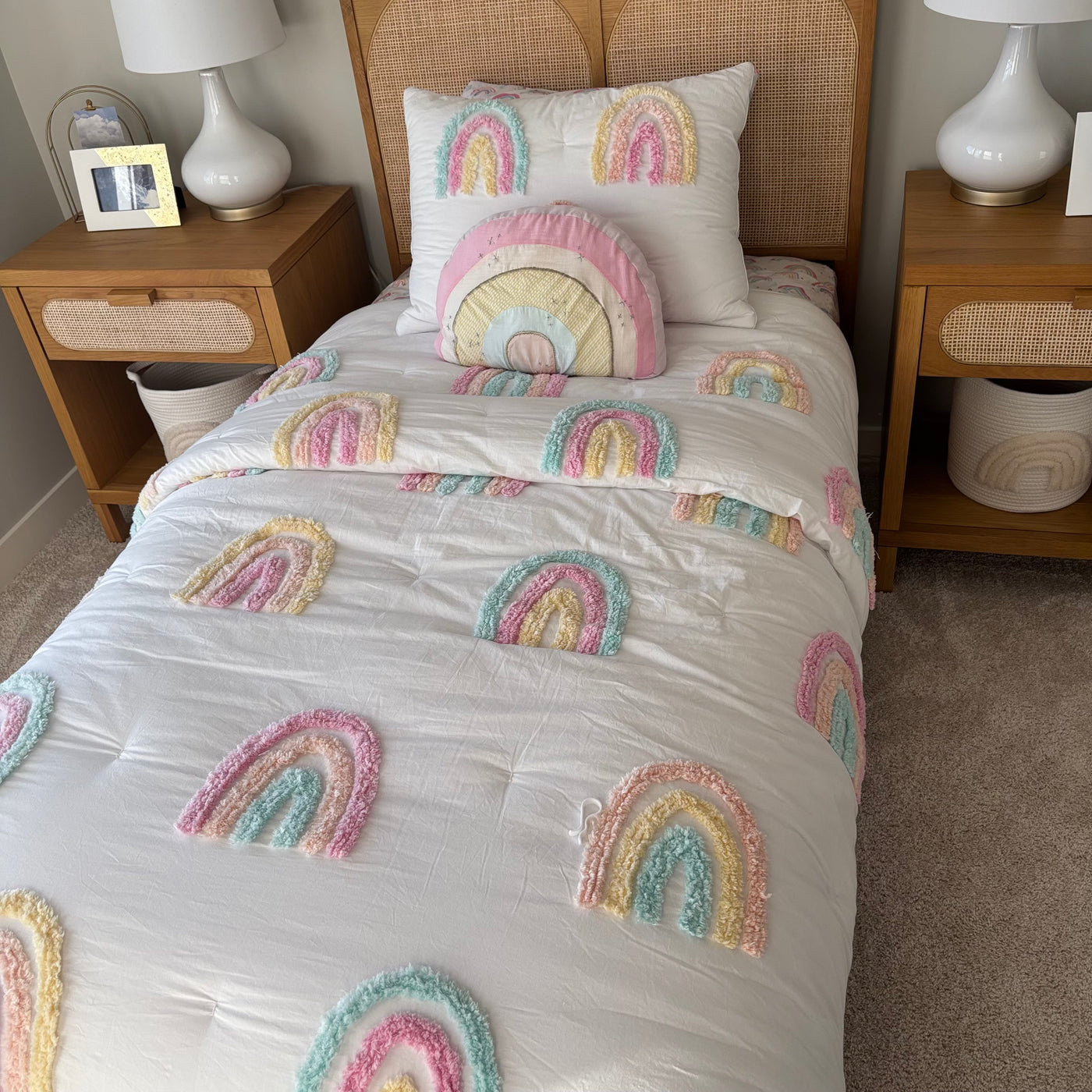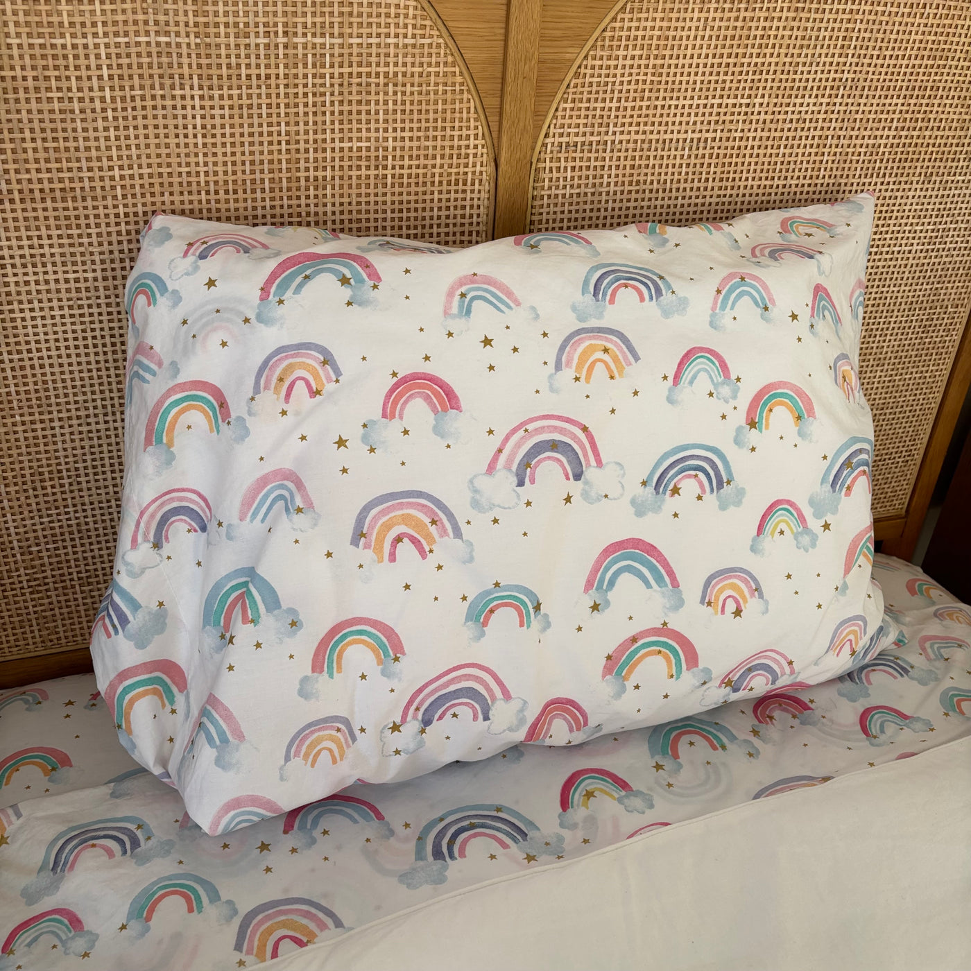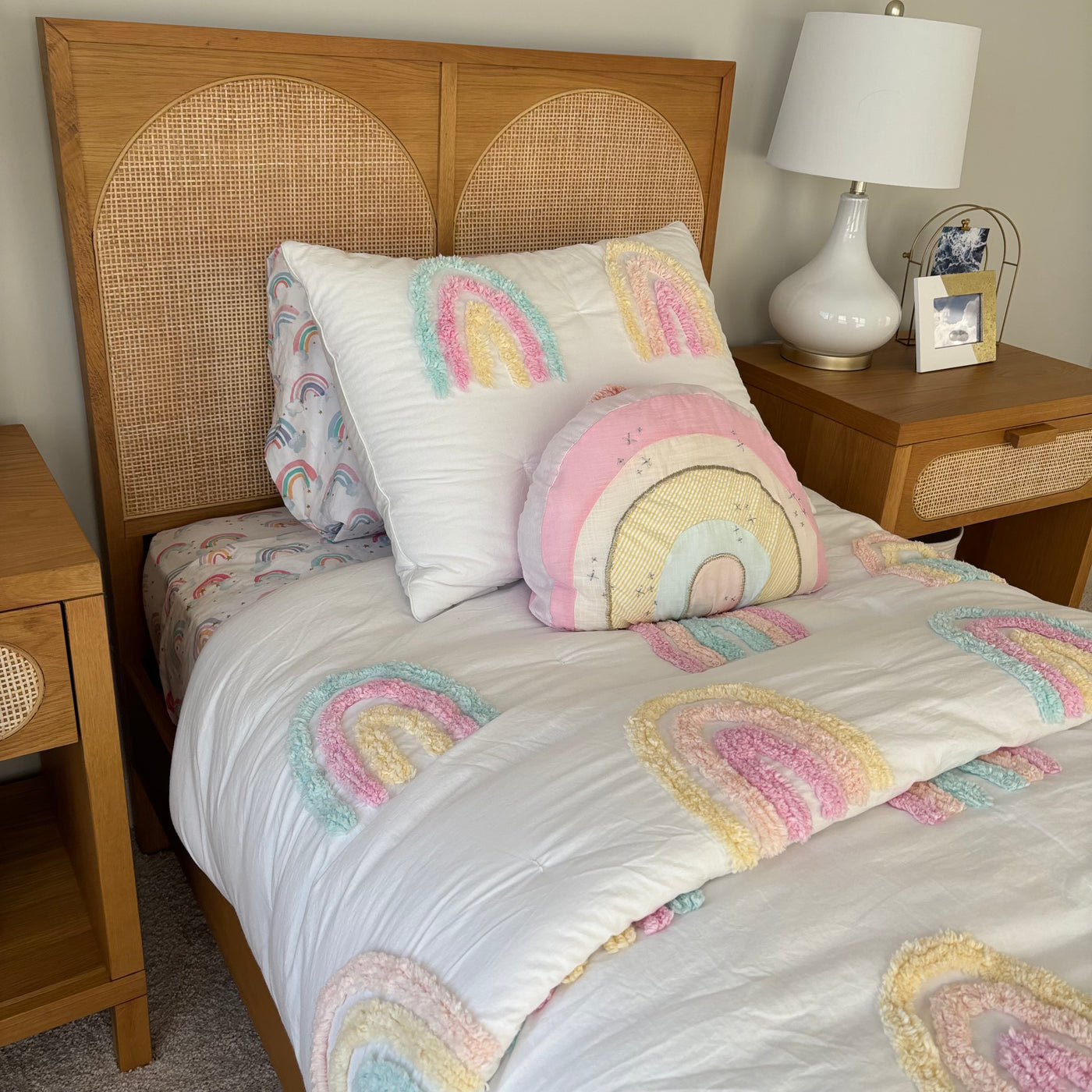 Includes 2 pillows with pillow cases, single size flat and fitted sheet, single size comforter and rainbow throw cushion