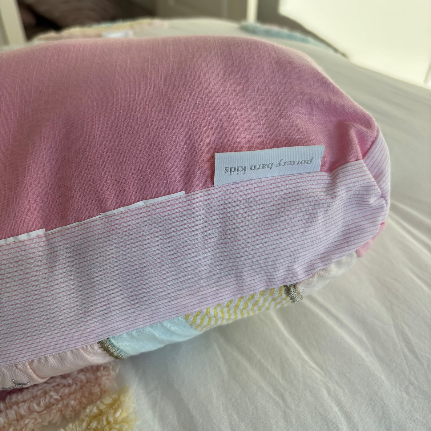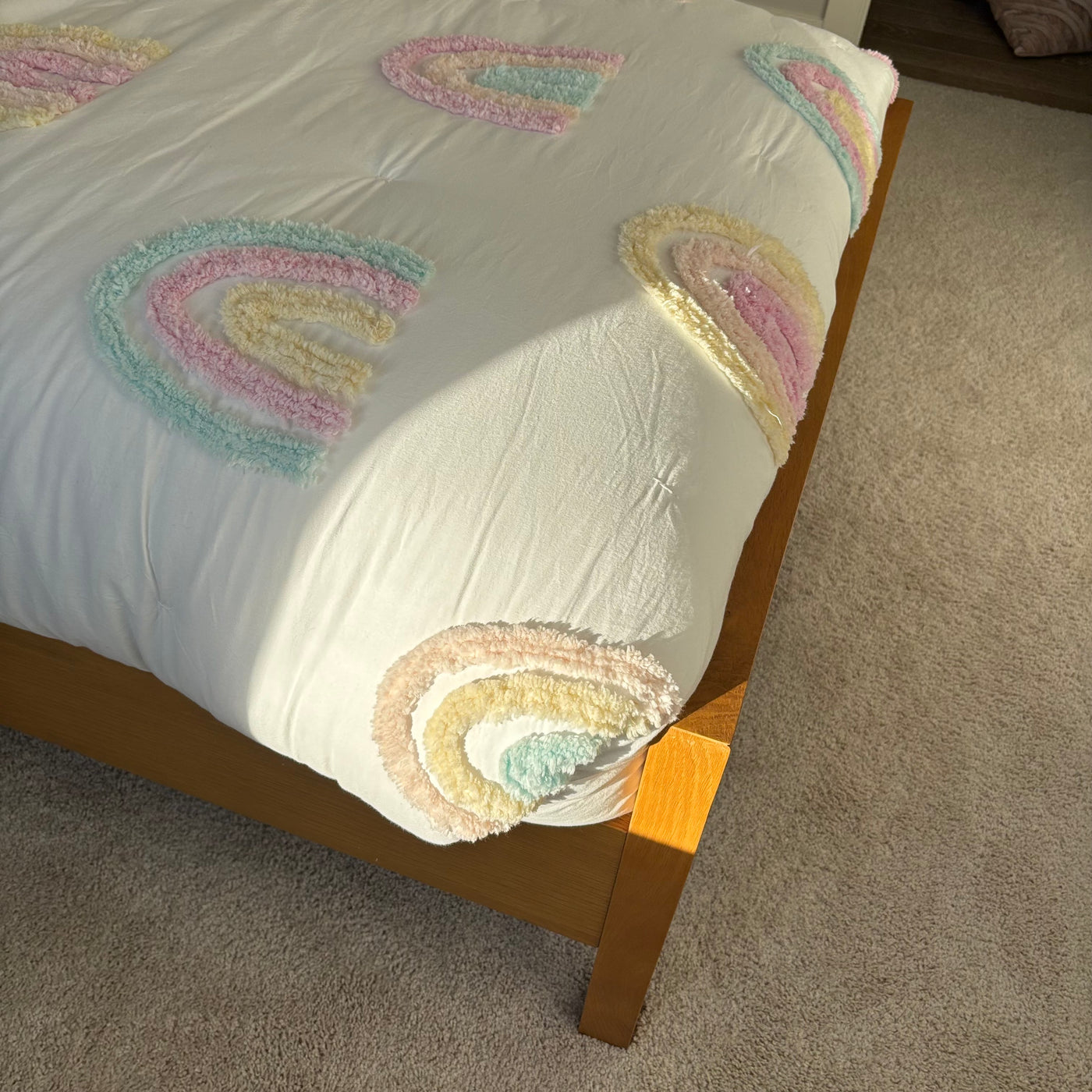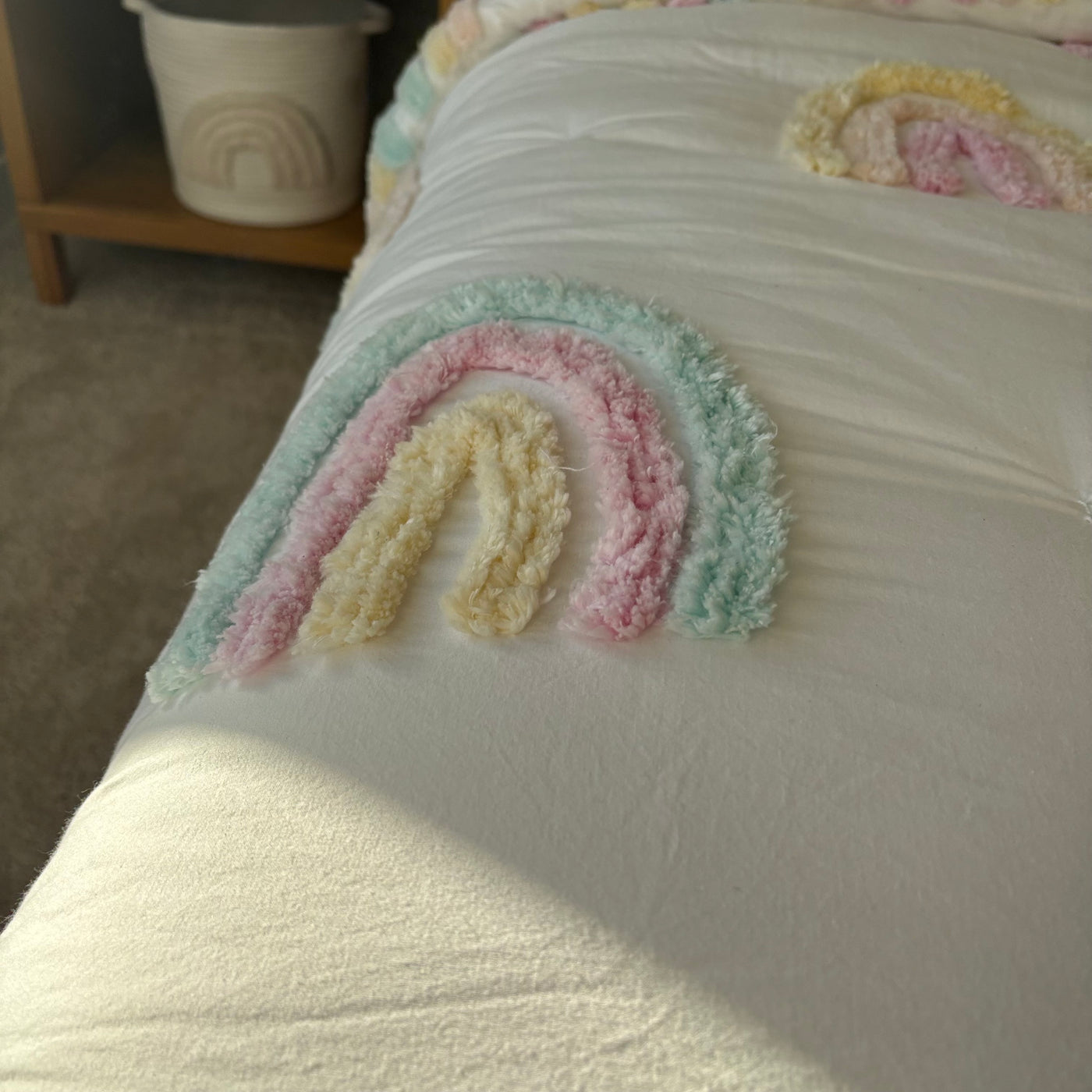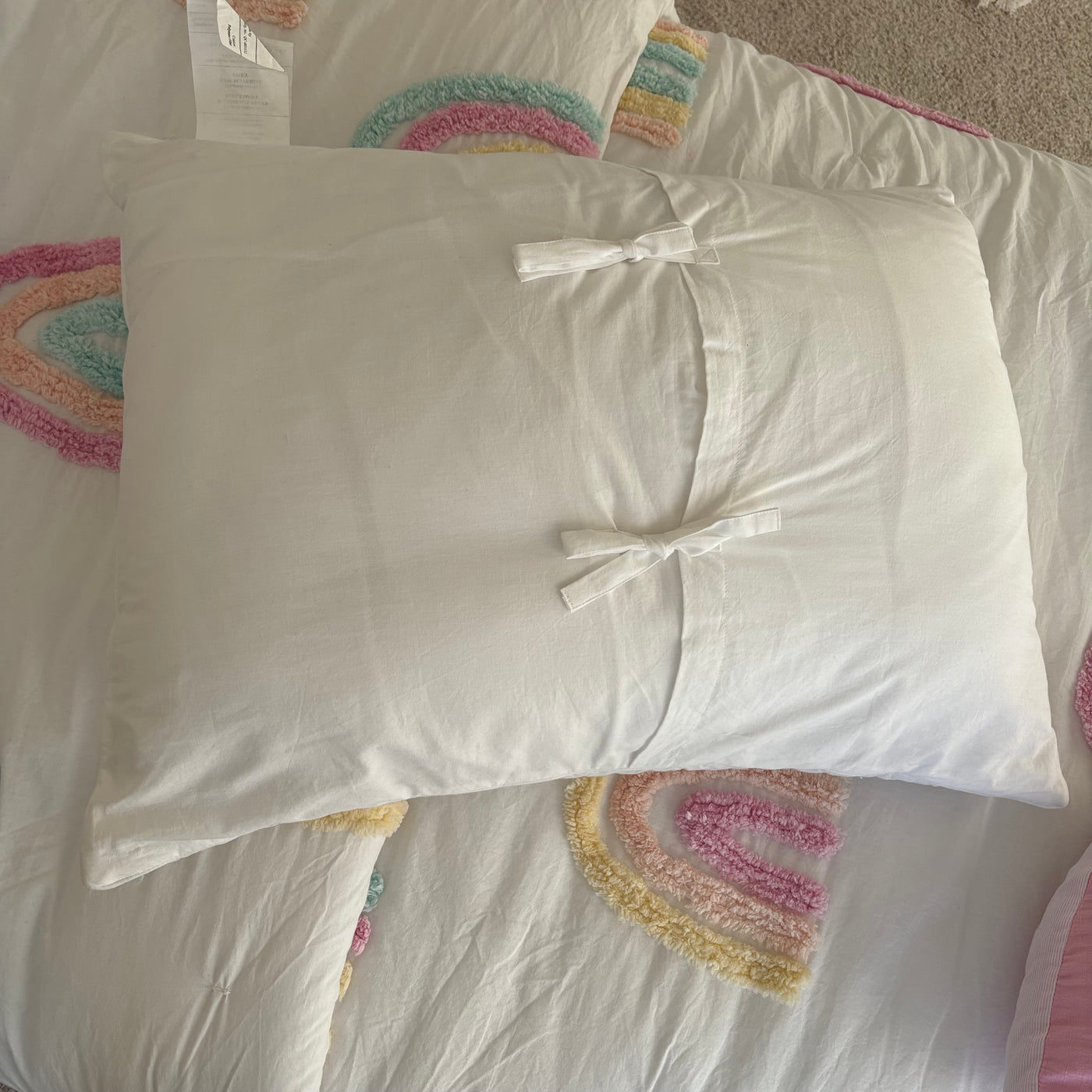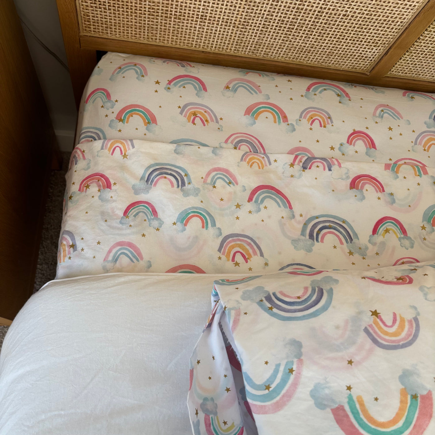 Includes 2 pillows with pillow cases, single size flat and fitted sheet, single size comforter and rainbow throw cushion