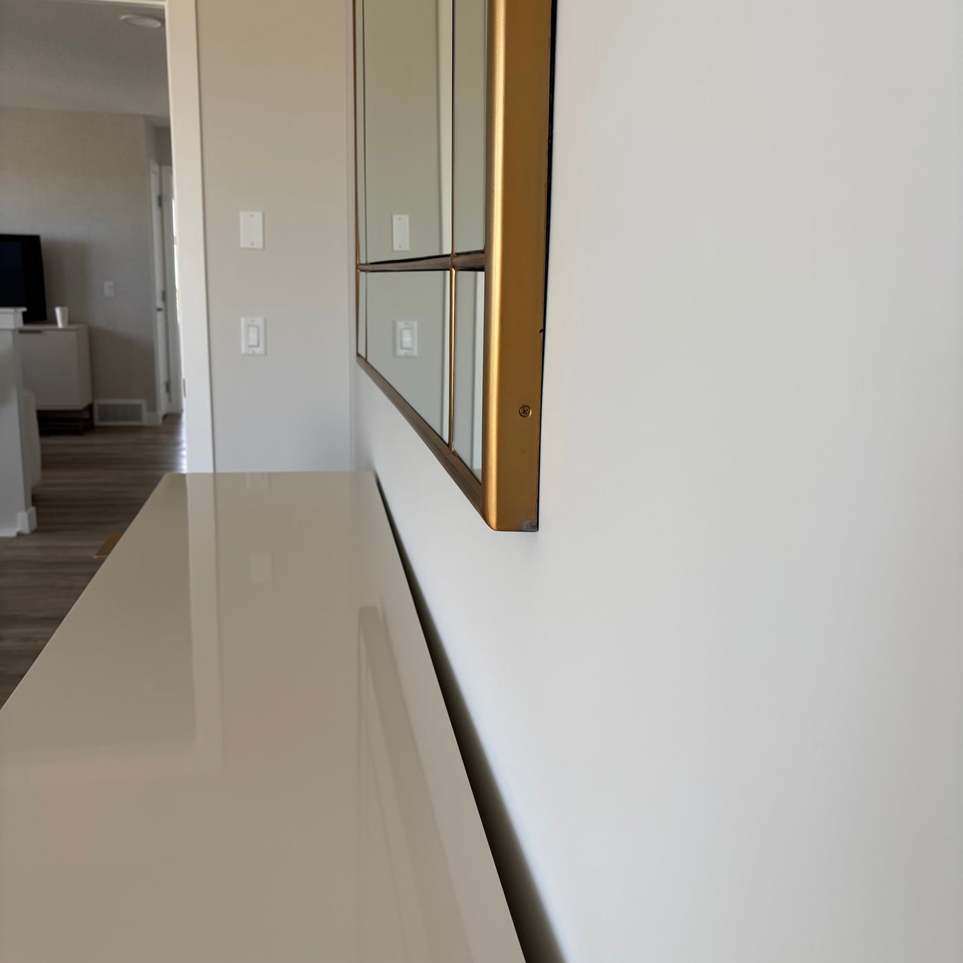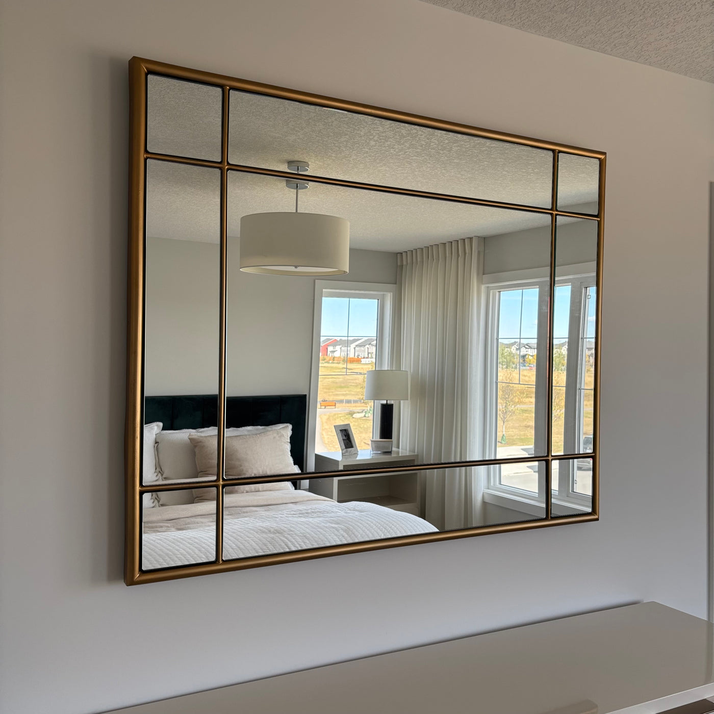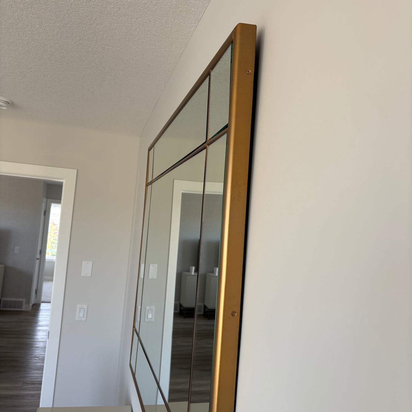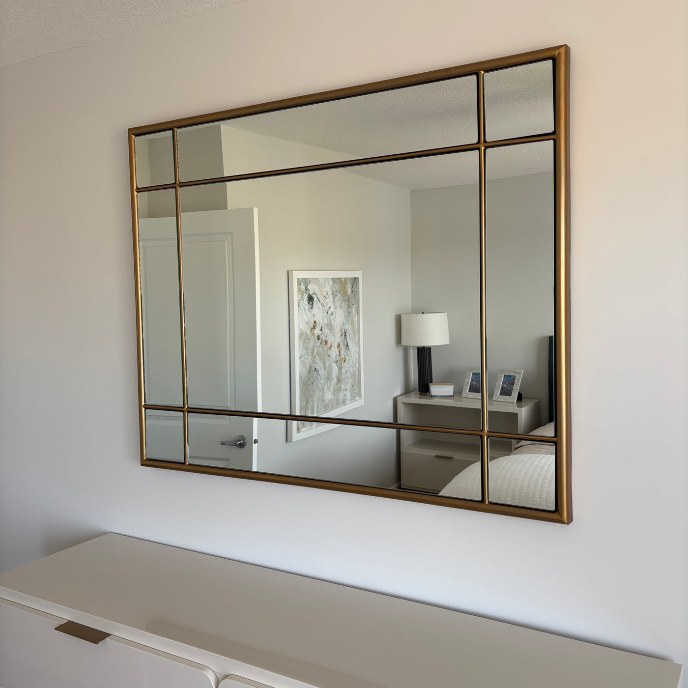 49” x 40” Antiqued Brushed Brass Framed Wall Mirror (Tile on top right is slightly separated) - G335